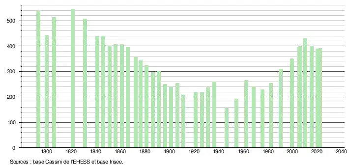 L'évolution du nombre d'habitants est connue à travers les recensements de la population effectués dans la commune depuis 1793. Pour les communes de moins de 10 000 habitants, une enquête de recensement portant sur toute la population est réalisée tous les cinq ans, les populations de référence des années intermédiaires étant quant à elles estimées par interpolation ou extrapolation[31]. Pour la commune, le premier recensement exhaustif entrant dans le cadre du nouveau dispositif a été réalisé en 2005[32].