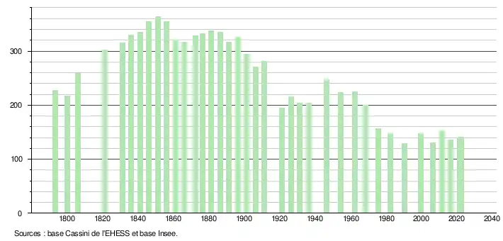 L'évolution du nombre d'habitants est connue à travers les recensements de la population effectués dans la commune depuis 1793. Pour les communes de moins de 10 000 habitants, une enquête de recensement portant sur toute la population est réalisée tous les cinq ans, les populations de référence des années intermédiaires étant quant à elles estimées par interpolation ou extrapolation[21]. Pour la commune, le premier recensement exhaustif entrant dans le cadre du nouveau dispositif a été réalisé en 2006[22].