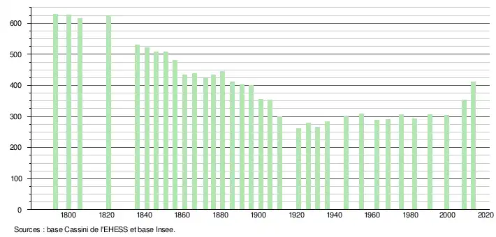 - ↑ Dans le tableau des recensements et le graphique, par convention dans Wikipédia, le principe a été retenu, pour les populations légales postérieures à 1999 de n’afficher dans le tableau des recensements et le graphique que les populations correspondant à l'année 2006, première population légale publiée calculée conformément aux concepts définis dans le décret no 2003-485 du 5 juin 2003, et les années correspondant à une enquête exhaustive de recensement pour les communes de moins de 10 000 habitants, ainsi que la dernière population légale publiée par l’Insee.