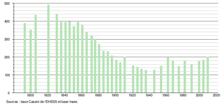 - ↑ Par convention dans Wikipédia, le principe a été retenu de n’afficher dans le tableau des recensements et le graphique, pour les populations légales postérieures à 1999, que les populations correspondant à une enquête exhaustive de recensement pour les communes de moins de 10 000 habitants, et que les populations des années 2006, 2011, 2016, etc. pour les communes de plus de 10 000 habitants, ainsi que la dernière population légale publiée par l’Insee pour l'ensemble des communes.