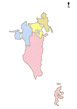 Avant le , le royaume était divisé en douze municipalités administrées de la capitale Manama. La carte suivante ne montre pas Madinat Hamad, qui a été séparé de Rifa et région Sud en 1991.