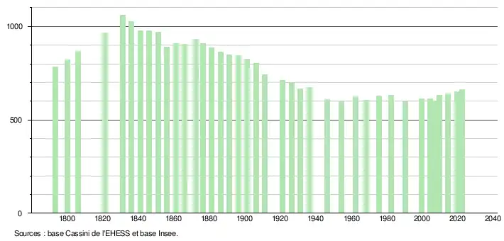 - ↑ Population municipale de référence en vigueur au 1er janvier 2025, millésimée 2022, définie dans les limites territoriales en vigueur au 1er janvier 2024, date de référence statistique : 1er janvier 2022.