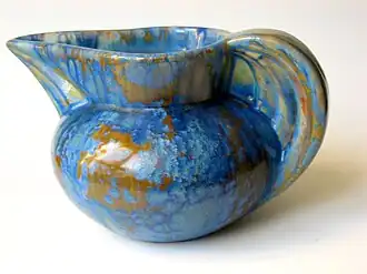 Sous la marque "La faience Héraldique", il produit de nombreuses pièces de ces grès de Pierrefonds à coulures d'émaux bleus qui sont surtout connus pour leurs spectaculaires cristallisations. S'éloignant des pièces des débuts, d'inspiration médiévale, il va développer des créations typiques de l'Art nouveau.