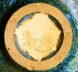 Les grès de Pierrefonds portent sous la base en creux la première marque de la manufacture représentant une tête de chevalier casqué entre les lettres F et H qui reprennent les initiales de sa raison sociale "La Faïence Héraldique".