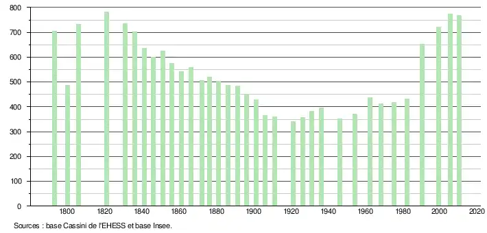 - ↑ Par convention dans Wikipédia, le principe a été retenu de n’afficher dans le tableau des recensements et le graphique, pour les populations légales postérieures à 1999, que les populations correspondant à une enquête exhaustive de recensement pour les communes de moins de 10 000 habitants, et que les populations des années 2006, 2011, 2016, etc. pour les communes de plus de 10 000 habitants, ainsi que la dernière population légale publiée par l’Insee pour l'ensemble des communes.