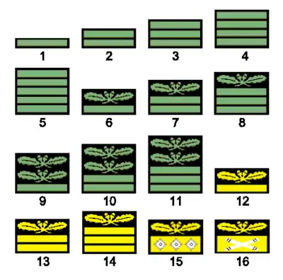 13. Generalleutnant ; 14. General der Nachrichtentruppe, General der Pioniere, General der Infanterie, etc. ; 15. Generaloberst ; 16. Generalfeldmarschall.