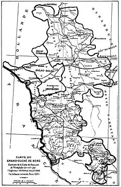 Le grand-duché de Berg (ou grand-duché de Clèves et de Berg) fut de 1806 à 1813 un État satellite de la France impériale, regroupant autour du duché de Berg d'innombrables principautés historiques du Saint Empire, aux confessions et traditions disparates. En tant que membre fondateur de la confédération du Rhin, le duché fit formellement sécession du Saint-Empire romain germanique le . D'abord gouverné par Joachim Murat puis par Napoléon lui-même, le grand-duché, souverain de jure, devait, avec le royaume de Westphalie, servir de modèle administratif pour les autres États composant la confédération du Rhin[1]. Le duché expérimenta de multiples réformes touchant l’administration, la justice, l'économie, sans oublier la réforme agraire. Ce fut aussi et surtout un État militaire, dont les troupes furent de toutes les campagnes napoléoniennes postérieures à 1808. Sa capitale était Düsseldorf, et le gouvernement siégeait pour partie dans l'ancien monastère jésuite, pour partie au palais du gouverneur (Statthalterpalais) de la Mühlenstrasse.