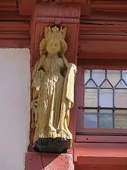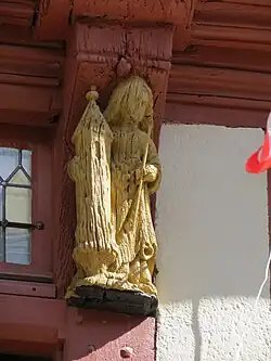 Maison à colombages rouges et blancs sur rue, en pierre sur cour, sa façade comporte des statuettes dorées de saints protecteurs[2]. Dans la cour, au revers de la maison, subsiste une belle tour d'escalier avec une porte gothique largement sculptée[3].