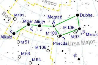 Prolongez une dizaine de fois le segment formé par Megrez (δ UMa) et Phecda (γ UMa), en direction de la constellation du Lion, et vous arriverez sur l'étoile Régulus (α leo). En prolongeant ce segment dans l'autre sens, en direction du Cygne, on arrive sur l'étoile Deneb (α Cygni).