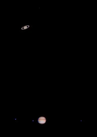 | 1 h 40 min 38 s UTC | Jupiter | 1°18' au Sud de Saturne | 25,1° Est |