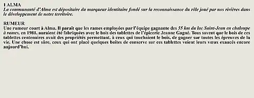 La rumeur et la curiosité de la communauté d'Alma (Québec, Canada) sont créés par Interaction Qui afin de tisser un fil conducteur légendaire entre les différentes localités de la région Saguenay—Lac-Saint-Jean.