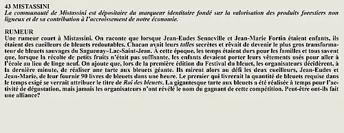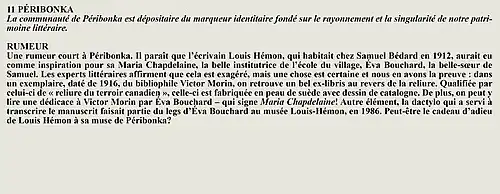 La rumeur et la curiosité de la communauté de Péribonka (Québec, Canada) sont créés par Interaction Qui afin de tisser un fil conducteur légendaire entre les différentes localités de la région Saguenay—Lac-Saint-Jean.