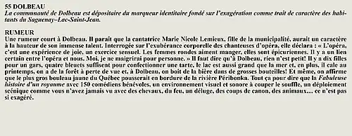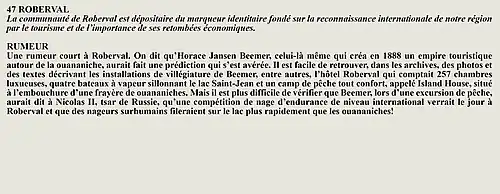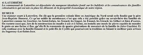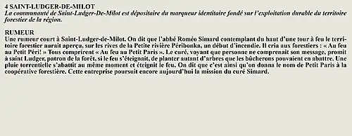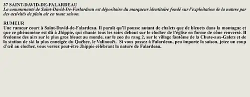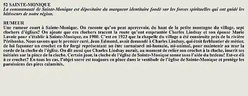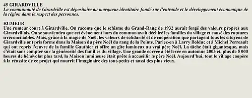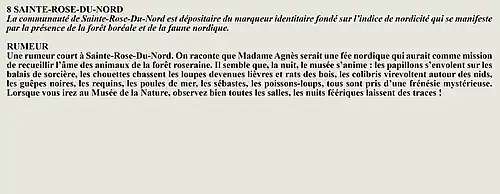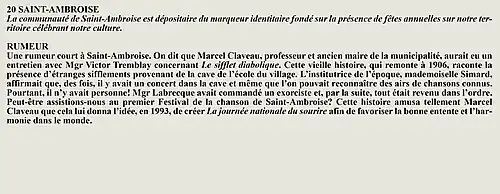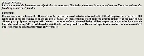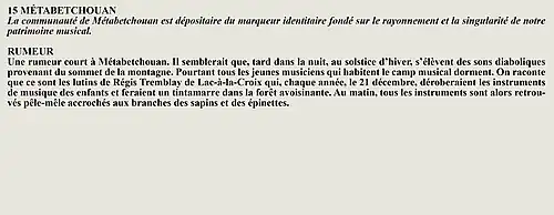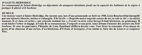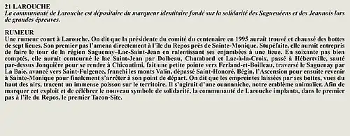La rumeur et la curiosité de la communauté de Larouche (Québec) (Québec, Canada) sont créés par Interaction Qui afin de tisser un fil conducteur légendaire entre les différentes localités de la région Saguenay—Lac-Saint-Jean.