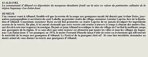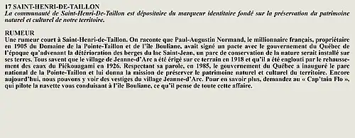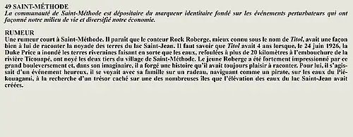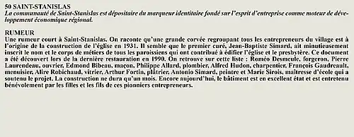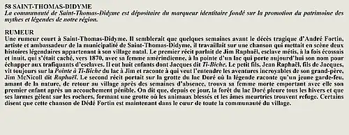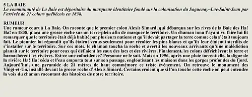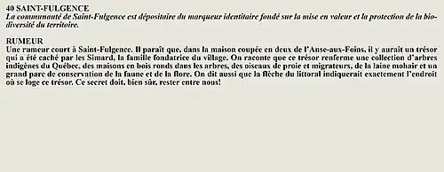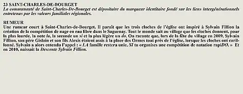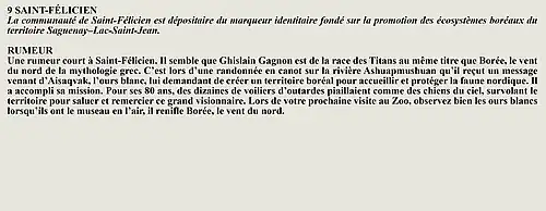 La rumeur et la curiosité de la communauté de Saint-François-De-Sales (Québec, Canada) sont créés par Interaction Qui afin de tisser un fil conducteur légendaire entre les différentes localités de la région Saguenay—Lac-Saint-Jean.