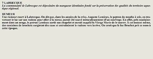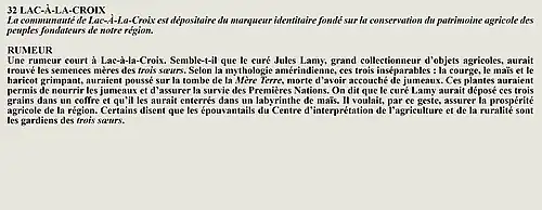 La rumeur et la curiosité de la communauté de Lac-à-la-Croix (Québec, Canada) sont créés par Interaction Qui afin de tisser un fil conducteur légendaire entre les différentes localités de la région Saguenay—Lac-Saint-Jean.