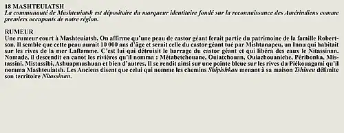 À l'arrivée des Européens, le territoire actuel de la région du Lac-Saint-jean était occupé par les Innus depuis 4 000 ans. Avant tout nomades, de tradition orale, ils ont inventé un type de société dont l'équilibre avec la nature constitue le principal fondement de leur culture. Ils ont mis sur pied un réseau important de circulation et d'échanges avec d'autres nations autochtones. Les traiteurs français et anglais en tireront d'ailleurs profit[31]. Le cycle des saisons détermine les activités. Le Tacon Site du Mythe[32] est réalisé dans le cadre de TraficArt, un événement artistique produit par la galerie Séquence (Chicoutimi, Québec, Canada) en . Il porte le numéro 06 sur la carte. Il fait partie des 5 Tacons Sites implantés par le duo d'artistes Interaction Qui sous le thème de l'Île à l'envers[20],[21],[22].
