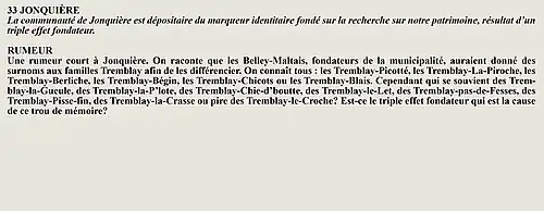La rumeur et la curiosité de la communauté de Jonquière (Québec, Canada) sont créés par Interaction Qui afin de tisser un fil conducteur légendaire entre les différentes localités de la région Saguenay—Lac-Saint-Jean.