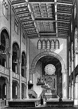 Du côté est de la nef sont regroupés la chaire et dans l'abside, la bimah et l'Aron Kodesh (l'Arche sainte). La chaire de la synagogue est comparable à la chaire d'une église chrétienne, avec pour décor des stalactites mais est couronnée d'une coupole de style islamique telle que l'on trouve sur les minbars des mosquées[5]. La bimah est située derrière une grille et derrière celle-ci un pupitre de lecture surélevé. De chaque côté de la grille, des marches conduisent à l'Arche sainte. L'Arche est divisée symétriquement en trois parties, avec une large partie centrale, et des parties latérales plus étroites[6].