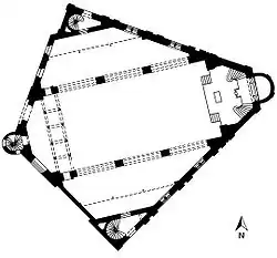 Le terrain de forme triangulaire où doit être élevée la synagogue, et les impératifs religieux imposant une orientation est-ouest du bâtiment, sont les contraintes architecturales dominantes. Simon conçoit en conséquence un bâtiment de forme trapézoïdale, unique en tant que synagogue. Deux rangées de quatre colonnes, séparent la nef principale, construite suivant l'axe imposé est-ouest, des nefs latérales ou bas-côtés, coupés en biais parallèlement aux deux rues en raison du plan trapézoïdal[1].
