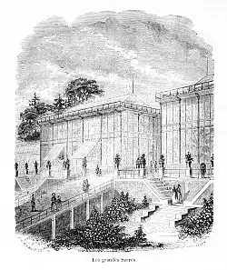 - Les serres : au fil du XVIIe siècle, le Jardin commence à se doter de vraies serres, dont la structure portante est une armature de baguettes de bois sertissant des carreaux de verre. Ces premières serres n'ont pas été conservées mais à l'époque elles étaient déjà conçues pour y entreposer toute l'année, et pas seulement en hiver, des spécimens botaniques exotiques collectés lors de voyages d'exploration. La première serre de ce type, dite « serre chaude », avait été commandée par Charles Bouvard (1572-1658). Plus tard, les plus remarquables serres du XVIIIe siècle ont été principalement édifiée par Joseph Pitton de Tournefort qui peu avant sa mort, en 1708, fit inaugurer deux serres chaudes[2]. Ensuite, en 1714, Sébastien Vaillant fit construire une nouvelle serre chaude, puis encore une autre en 1717. Buffon, quant à lui, en fera édifier une en 1788. Par les termes « serre chaude » ou « serre tempérée » on se référait à l'époque au fait que ces serres contenaient en elles des plantes provenant de climats chauds. Au XIXe siècle, les avancées techniques des serres anglaises permettent à l'architecte Charles Rohault de Fleury, de retour d'un voyage à Londres, de concevoir et faire construire entre 1833 et 1836 un ensemble de grandes serres qui ne dépendent plus de l'orientation au soleil parce qu'elles sont chauffées à la vapeur. Pour le projet d'origine, Charles Rohault de Fleury avait dessiné un ensemble plus vaste mais seulement deux pavillons furent construits et inaugurés en 1836, les actuelles serres dites de Nouvelle-Calédonie (ancienne serre mexicaine) et de l'histoire des plantes (ancienne serre australienne). Plus tard, en 1850, Rohault de Fleury prévit de compléter les deux serres existantes par une serre monumentale. Celle-ci ne fut pas réalisée mais remplacée par celle inaugurée seulement en 1889, ce bien après la mort de Charles Rohault de Fleury.