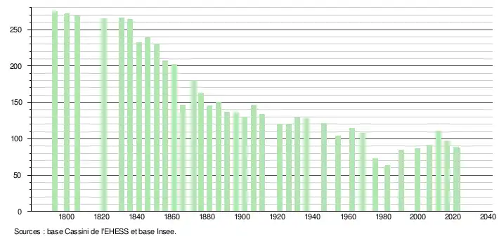 L'évolution du nombre d'habitants est connue à travers les recensements de la population effectués dans la commune depuis 1793. Pour les communes de moins de 10 000 habitants, une enquête de recensement portant sur toute la population est réalisée tous les cinq ans, les populations de référence des années intermédiaires étant quant à elles estimées par interpolation ou extrapolation[16]. Pour la commune, le premier recensement exhaustif entrant dans le cadre du nouveau dispositif a été réalisé en 2006[17].