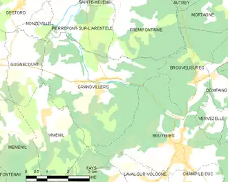 Grandvillers est située à 6 km de Bruyères, sur une colline. Le village s'étire sur le parcours de la route départementale D 420. Il est traversé par le Durbion et par l'Arentèle.