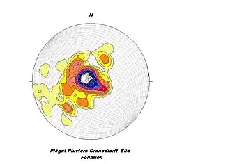 Malgré un aspect plutôt homogène, la granodiorite de Piégut-Pluviers porte une foliation d'origine tectonique, évidente sur les affleurements superficiels les plus altérés. Cela démontre que la granodiorite a continué à se déformer au cours de l'orogenèse varisque même au stade subsolidus avec les roches encaissantes. L'image du réseau stéréo montre l'organisation spatiale de la granodiorite. On distingue un schéma croisé formé par la direction NO-SE et NE-SO, très typique pour cette partie du Massif Central. Ce modèle peut être interprété comme suit :