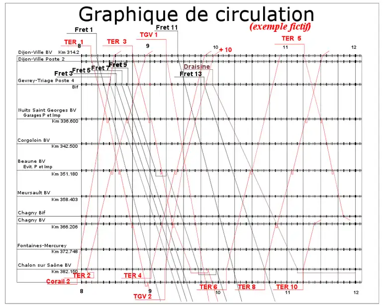 Section de ligne de Dijon à Chalon-sur-Saône. Un graphique de circulation (fictif)