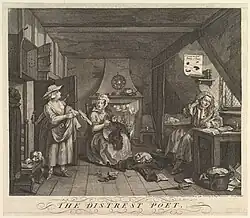 William Hogarth a réalisé plusieurs œuvres sous forme de séries, dont les aspects réalise, contemporain et narratif ont une visée morale et éducative. Il aborde des sujets politiques, religieux et sociaux, tout en usant également d'« inventivité et de verve » dans de petites œuvres comme des billets de souscription pour ses gravures[8]. Au total, Hogarth produit plus de deux cent cinquante gravures, dessinées ou gravées[8].