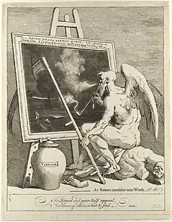 - ↑ Reprise de l'auto-portrait de Hogarth, pour répliquer à une attaque du révérend Charles Churchill[42].
