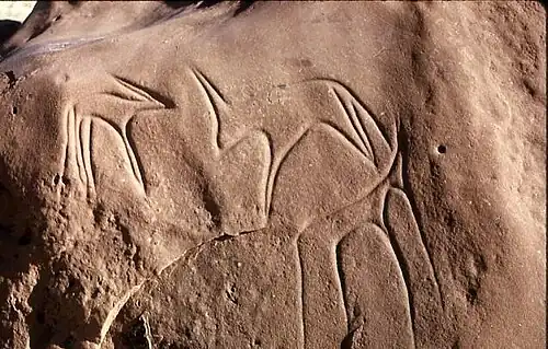 Des chevaux et des chameaux (considérés comme introduits au IIIe siècle de notre ère) de petite taille s'y trouvent associés à des inscriptions diverses sans patine.