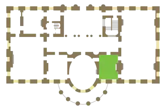 La pièce mesure approximativement 8,40 m par 6,75 m. Elle possède six portes qui donnent vers le Cross Hall, l'East Room, le portique Sud et la Blue Room.