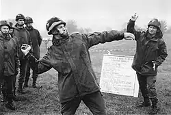 - déploiement d'un parachute après le lancer de la grenade, pour la faire tomber à la verticale (peu précis) ;