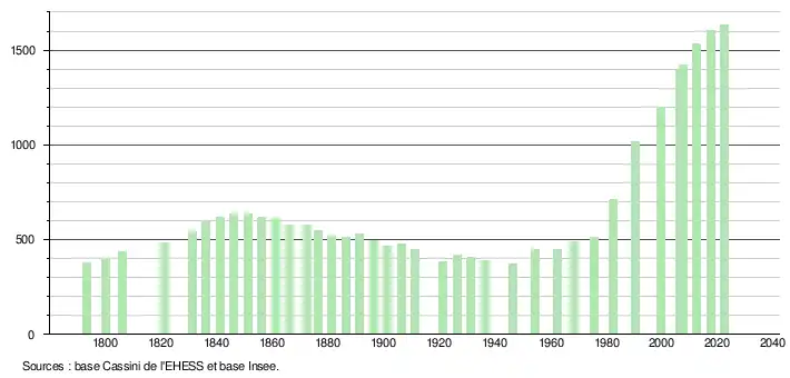 L'évolution du nombre d'habitants est connue à travers les recensements de la population effectués dans la commune depuis 1793. Pour les communes de moins de 10 000 habitants, une enquête de recensement portant sur toute la population est réalisée tous les cinq ans, les populations de référence des années intermédiaires étant quant à elles estimées par interpolation ou extrapolation[16]. Pour la commune, le premier recensement exhaustif entrant dans le cadre du nouveau dispositif a été réalisé en 2007[17].