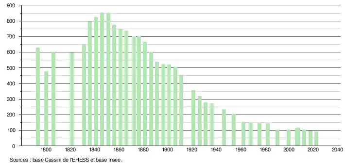 L'évolution du nombre d'habitants est connue à travers les recensements de la population effectués dans la commune depuis 1793. Pour les communes de moins de 10 000 habitants, une enquête de recensement portant sur toute la population est réalisée tous les cinq ans, les populations de référence des années intermédiaires étant quant à elles estimées par interpolation ou extrapolation[13]. Pour la commune, le premier recensement exhaustif entrant dans le cadre du nouveau dispositif a été réalisé en 2007[14].