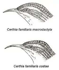 - C. f. macrodactyla Brehm, 1831, de protonyme Certhia macrodactyla, vit en Europe de l'Ouest. Le dessus est plus pâle et le dessous plus blanc que chez britannica[4] ;