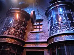 Gringotts (Gringotts Wizarding Bank) est la banque des sorciers. Il s’agit d’un grand bâtiment d’une blancheur de neige, avec un portail en bronze étincelant[2]. Bill Weasley, un des frères de Ron, travaille au sein de cette banque, pour sa succursale égyptienne[13]. Elle est dirigée par des Gobelins et est réputée pour être un lieu très sûr. Selon Hagrid, il faudrait être « fou » pour tenter de la cambrioler[2]. À l'intérieur de la banque, sur une porte d'entrée en argent, sont gravées quelques lignes destinées à dissuader les éventuels cambrioleurs[2].