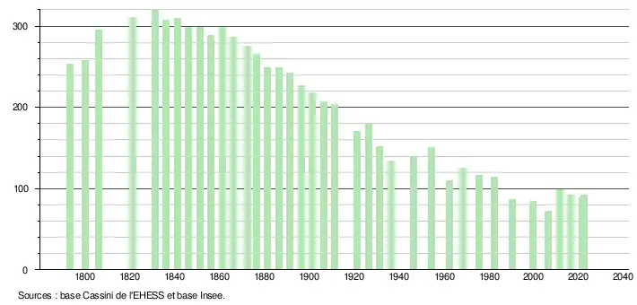 L'évolution du nombre d'habitants est connue à travers les recensements de la population effectués dans la commune depuis 1793. Pour les communes de moins de 10 000 habitants, une enquête de recensement portant sur toute la population est réalisée tous les cinq ans, les populations de référence des années intermédiaires étant quant à elles estimées par interpolation ou extrapolation[21]. Pour la commune, le premier recensement exhaustif entrant dans le cadre du nouveau dispositif a été réalisé en 2006[22].