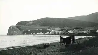 Gros-Morne vers 1930. À l'avant-plan, des filets de pêche suspendus pour le séchage et un petit bateau de pêche ("flat") tiré sur la grève. Au centre, une série de maisons alignées le long du rivage, derrière lesquelles on trouve plusieurs autres bateaux de pêche. La route traverse le village pour ensuite remonter la montagne, à droite du cap.