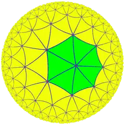 L'ion complexe Hexaaquacuivre (II), [Cu(OH2)6]2+. Comparé à une forme parfaitement symétrique, la molécule est dilatée verticalement d'environ 22 % (effet Jahn-Teller). Le groupe de triangle (2,3,7), un groupe hyperbolique, opère sur ce pavage du plan hyperbolique.