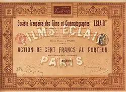 Créée à Épinay-sur-Seine en 1907 par l'industriel Charles Jourjon (1876-1934) et Ambroise-François Parnaland (1854-1913), la société Éclair se destine dans un premier temps à la production de films : entre 1908 et 1918, Éclair est la troisième firme française après Gaumont et Pathé. Elle emploie de grands réalisateurs, comme Maurice Tourneur et Victorin Jasset, ainsi que des acteurs tels que Charles Krauss, André Liabel, Camille Bardou[2]. La société Éclair s'implante aux États-Unis, à New York en 1909, à Fort Lee en 1911, et enfin à Tucson en 1913. Une filiale est aussi implantée en Allemagne, à Berlin, sous le nom de "Decla" (Deutsche Eclair). Elle prend sous contrat Émile Cohl, pionnier français du dessin animé, à partir de 1912. Mais elle est victime successivement de la mort de Jasset (), de l'incendie de ses studios et laboratoires de Fort Lee (), et de graves problèmes bancaires ; elle perd également Émile Cohl et Maurice Tourneur, qui décident de rester aux États-Unis à la fin de la Première Guerre mondiale.