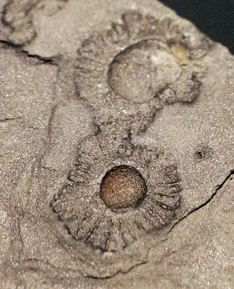 - ↑ « Growth, Duplication and Lateral Mutual Compressive Deformation of Akouemma hemisphaeria on the Seafloor of Okondja Basin at 2.2 Ga (Gabon) » (en)
