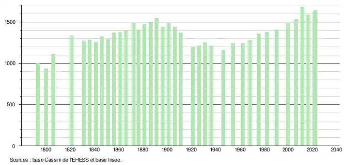 L'évolution du nombre d'habitants est connue à travers les recensements de la population effectués dans la commune depuis 1793. Pour les communes de moins de 10 000 habitants, une enquête de recensement portant sur toute la population est réalisée tous les cinq ans, les populations de référence des années intermédiaires étant quant à elles estimées par interpolation ou extrapolation[23]. Pour la commune, le premier recensement exhaustif entrant dans le cadre du nouveau dispositif a été réalisé en 2006[27].
