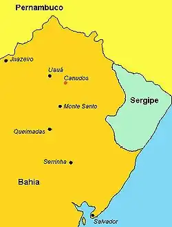 La portion de territoire circonvoisinant la fazenda de Canudos apparaît, même selon les normes du sertão, comme très faiblement peuplée, avec une densité de population de seulement 0,6 habitant par km2 (selon le recensement de 1890), et confinait vers le nord-ouest au Raso da Catarina, étendue très aride et quasi inhabitable. La partie du sertão et de l’agreste qu’Antônio Maciel parcourut pendant ses vingt années de pérégrinations, appelée pour cette raison sertão du Conselheiro, et dans laquelle se situe aussi Canudos, s’étendait dans les États contigus de la Bahia et du Sergipe, englobait une dizaine de communes (les municípios de Pombal, Soure, Conde, Inhambupe, Entre Rios, Alagoinhas, Itapicuru, Tucano, Monte Santo et Jeremoabo), et comptait près de 220 000 habitants (pour 1,9 million d’habitants dans l’ensemble de l’État de la Bahia). En 1872, soit 16 ans avant l’abolition de l’esclavage, le pourcentage d’esclaves dans cette même région s’établissait à 10,75 % en moyenne ; à Jeremoabo, ce chiffre était faible (moins de 4 %), mais fort élevé à Monte Santo (12,7 %) et à Entre Rios (23,7 %)[24].