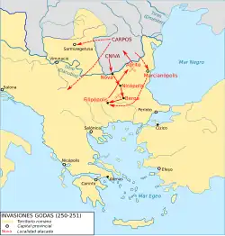 Les invasions reprirent en 250 : les Carpes[N 1] attaquèrent la Dacie [1] pendant que le roi goth Cniva à la tête de diverses unités goths et alliées défit les Romains lors de deux batailles. L’empereur Dèce (r. 249-251) devait périr lors de l’une d’elles de même que son coempereur Herennius Etruscus (r. 251). Son successeur Trébonien Galle (r. 251-253) promit de reprendre le versement d’un tribut annuel si les envahisseurs se retiraient. Il ne tint cependant pas parole, ce qui conduisit à de nouvelles attaques en 253; toutefois le gouverneur et futur empereur Émilien (r. 253) réussit à mettre un terme à ces raids.