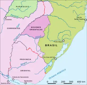 Dans les années 1730, la Bande orientale était peu peuplée, située à la frontière entre territoires espagnols (Gouvernorat du Río de la Plata (en)) et portugais (Brésil colonial). L'Espagne avait des vues sur la région, se basant sur les clauses du Traité de Tordesillas de 1494, accordant aux Espagnols la majeure partie du continent sud-américain, en dehors de l'actuel Brésil. Malgré ces prétentions, c'était le Portugal, qui, le premier, s'était mis à coloniser la Bande en fondant la ville de Colonia del Sacramento en 1680. Les Espagnols s'en étaient emparés à deux reprises, d'abord en 1681, puis en 1705, mais avaient dû la rendre aux Portugais en vertu du Traité d'Utrecht de 1713.