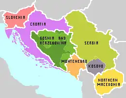 Les guerres de Yougoslavie sont parfois appelées « troisième guerre balkanique »[25]. Il s'agit d'une série de conflits entre les six républiques yougoslaves qui se sont déroulés entre le et le .