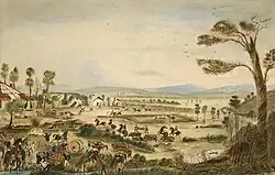 Peu de temps après l'établissement de la colonie, un grand nombre de moutons et de bovins ont été amenés par voie terrestre depuis les colonies de l'Est. Il y a eu de nombreux cas de conflit entre les peuples autochtones et les bouviers, les premiers désirant la protection du pays et les seconds s'empressant de tirer pour se protéger et protéger leurs troupeaux[43]