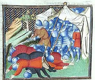 - ↑ La liste des gentilshommes de cette armée mentionnée par la Chronique... (op. cit.), commence par "monseigneur Louis de Harecourt, monseigneur de Piquegny, monseigneur d’Aubegny, le baron de Coussi, monseigneur Hue de Chasteillon, monseigneur de Roye, monseigneur Mathieu de Roye, monseigneur Raoul de Reneval, monseigneur de Preaulx, monseigneur Mouton sire de Blainville, le preux chevalier monseigneur de Buyville, monseigneur Guillaume du Melle..."'. Les chevaliers tuèrent 7 000 paysans pendant la bataille, puis exécutèrent 20 000 révoltés pendant les deux semaines suivantes.