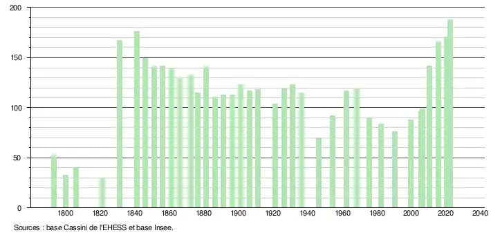 L'évolution du nombre d'habitants est connue à travers les recensements de la population effectués dans la commune depuis 1793. Pour les communes de moins de 10 000 habitants, une enquête de recensement portant sur toute la population est réalisée tous les cinq ans, les populations de référence des années intermédiaires étant quant à elles estimées par interpolation ou extrapolation[28]. Pour la commune, le premier recensement exhaustif entrant dans le cadre du nouveau dispositif a été réalisé en 2005[29].